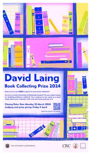 David Laing Book Collecting Prize - Poster Design Competition In previous years, the Centre for Research Collections has run a competition, open to Graphic Design and Illustration students at Edinburgh College of Art, to design an eye-catching A3 poster to advertise The David Laing Student Book Collecting Prize. It is not possible to run a competition for 2025-26, but hopefully it will return in another year. Here are the two most recent winning designs. 2024-25 See below for Katie Noble's winning design for 2024-25. 2023-24 See below for Tianxi Wang's winning design for 2023-24. This article was published on 2024-08-21